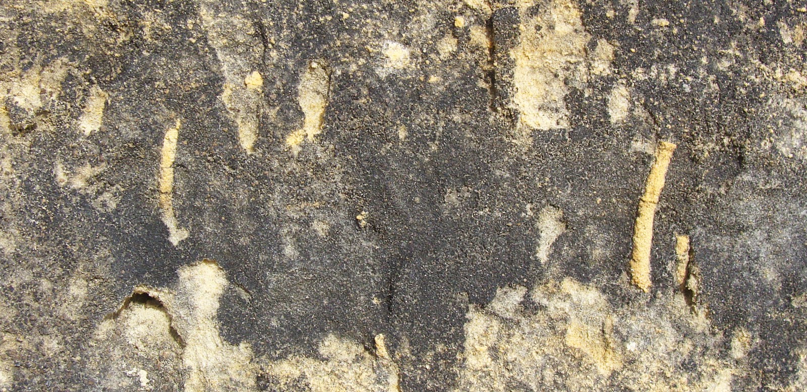 The vertical tubes on this face of the weathered sandstones of Ferry Bluff were made by ancient animals that burrowed into the sand along the Cambrian sea.