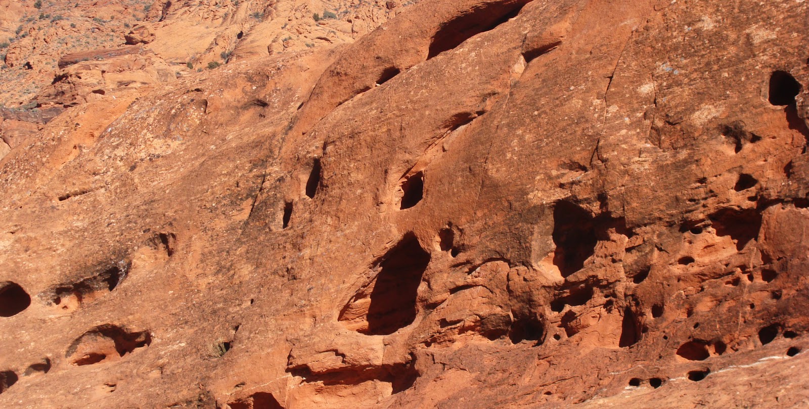 Pine Valley Mountains, a granite intrusion, in the rear with the Red Cliffs in front. The granite intruded into the area about 20-21 million years ago, warping up the surrounding rock layers. This type of intrusion is called a laccolith.