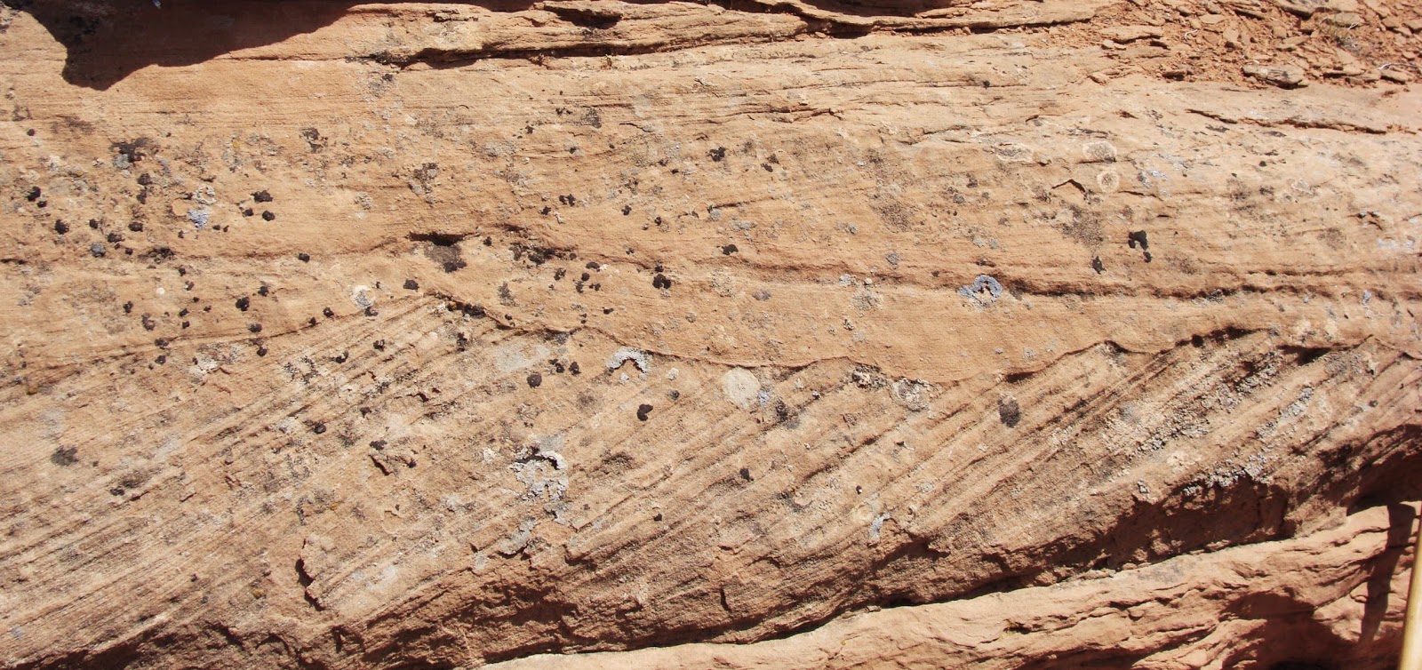 The small white rectangular blades and rosettes seen on this sandstone surface are salt casts: places where salt crystals grew in the sand and then later dissolved away. This layer of sandstone is at the top of the red cliff and forms the first layer of the deck of the Red Fleet ship.